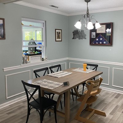 We LOVE this table! I read the reviews and a lot complained that it had a grayish hue to it in person but our floors are gray so I thought it would be perfect and I’m really pleased with the outcome. My husband is 6’6” so one concern was if his legs would fit under comfortably and they do with some room to spare but isn’t too high for average height people like myself (5’7”). We paired with the Malden French Bistro Dining Chairs (also from Target) and I love how it all looks together!
