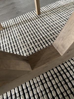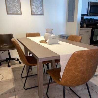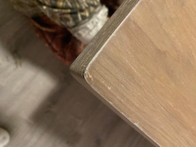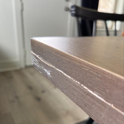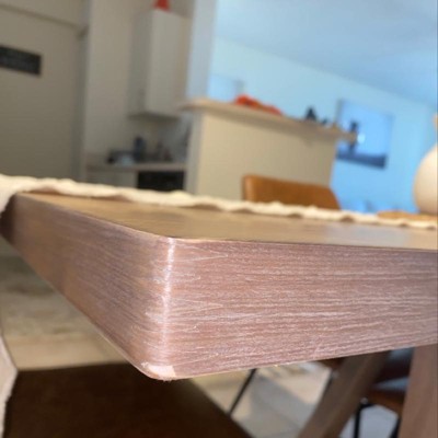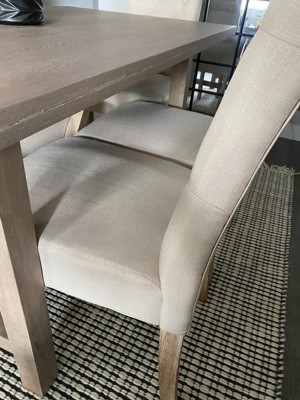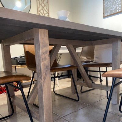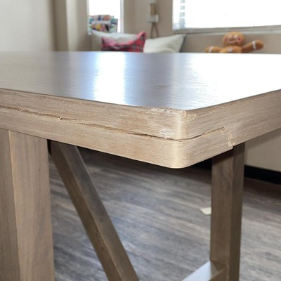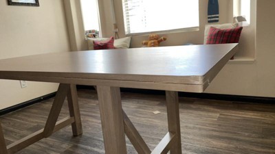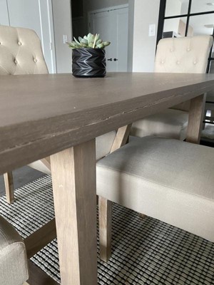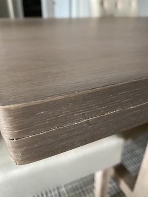 A few things about this table. The color is a great grey/taupe wood. Some things to consider: - Came super damaged. Had to glue a piece back on that broke off of the leg, the whole perimeter of the table was messed up in some way. The damage was minor but literally all around. - I cannot tuck two dining chairs in between the legs on the long sides. Two people will easily fit on the long side, but with the legs, it's awkward. Something to check if you already have chairs prior to buying. - It was easy to assemble. My husband did it by himself when I was at work. - The table is low quality - I would not pay more than $250 for this table. The good thing for our family is that we have a little one and it will definitely get some use and I like in that regard that it isn't too nice That is also part of why I decided to keep it damaged. All in all, it might be worth it to take a chance to see how bad the damage is when it arrives. I got the table on sale for like $260 and used some gift cards and worked with Target on the damage. We came to a resolution and I kept it due to the great price and style.