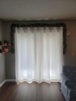 [This review was collected as part of a promotion.] I got this curtain for my french doors. They fit very well. There is plenty to gather. The length is perfect, too. I like that the wand to draw the curtains can be used on either side, and it's out of the way so you don't see it all the time. My one complaint is that I don't like the shiny sheen to it. Matt would have been better or just not so shiny. This blocks the light pretty well. As well as you can expect a white curtain.