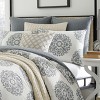 Large scroll medallions in silvery gray are elegant and updated in this clean graphic layout, softened by a subtle stripe overprint texture on a cream background. The tonal texture appears again on the gray duvet reverse and European shams, adding depth and richness to this inviting ensemble. Layer in our ivory Micro Mink quilt and shams and an embroidered accent pillow for added comfort and decorator style. Full/Queen Duvet set includes: Full/Queen duvet (92"x88") and two standard shams (20"x26"). King Duvet set includes: King duvet (92"x106") and two king shams (20"x36").