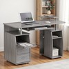 The Furnifact gray office desk is a practical and elegant solution for those seeking a multifunctional workspace with a refined design. Constructed from durable MDF wood panels and finished in a moisture-resistant gray laminate, this wood desk combines durability with a modern look suited for any room. It includes two storage drawers that glide smoothly, ideal for organizing documents, writing tools, and other essentials. A pull-out keyboard tray with a built-in safety stop promotes ergonomic comfort while freeing up space on the desktop. An elevated accessory shelf above the pedestal adds vertical storage, perfect for keeping items like books or small devices within reach. A slide-out accessory shelf also includes a safety stop and can serve as a convenient station for smaller peripherals or notepads. The open CPU cabinet on the side includes a removable shelf that can be adjusted or taken out entirely depending on your equipment needs, while a rear cable opening promotes clean cord management. This gray desk supports a desktop weight capacity of 80 lbs., with each shelf able to hold up to 30 lbs., and each drawer up to 22 lbs., offering solid support for home office or study use. Whether used as a student desk, computer desk with drawers, or simple desk for working from home, this versatile piece of office furniture brings clarity and organization to any workspace. The product will be delivered in its original manufacturer packaging.
