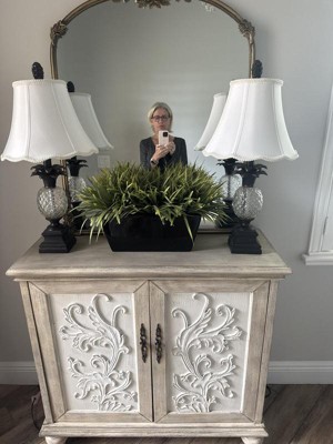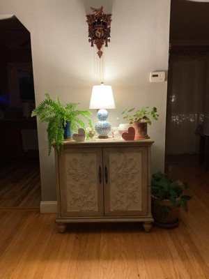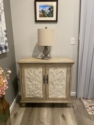 The Grayson 2-Door Cabinet offers a perfect blend of functionality and style for your home decor. This accent chest features a floral design on the cream-hued door panels that adds an elegant touch to the design. The natural-hued frame and legs complement the doors, creating a rich contrasting farmhouse look. With a single shelf to help organize your essentials, this 2-door cabinet brings a rustic charm and additional storage to your living space. Leg assembly is required.