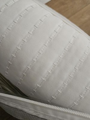 [This review was collected as part of a promotion.] It's interesting the pattern almost looks like a waffle pattern from the picture but it's actually more like linear stitched lines which I love. The fabric is super soft and the quilt is not overly thick or heavy but definitely thick enough it's going to keep you warm. We're currently in the midst of construction so I'm keeping it in the bag because I don't want this beautiful white to no longer be white. I did set it up over my queen bed to get a good pic of it and I just love the way that this white looks it's a nice Crisp fresh looking white and it appears awesome with bright colors. I plan on folding this one and keeping it at the end of my bed as a statement accent piece. Great size to great quality I imagine nothing but goodness with this.