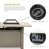 Elevate your Outdoor Living Space with our Outdoor Fire Pit Conversation Set. Designed with a Modern Design aesthetic and Durable Construction, this all-weather ensemble features a UV Protected and Resistant Aluminum Frame, ensuring longevity and visual appeal. Nestled at the heart of this set is a Tabletop Fire Pit, generating a potent 55,000 BTU of heat via Gas Propane. With intuitive Flame Control, modulate the fire to suit your entertainment needs. Features a Multi-Functional Table space with an integrated Ice Chest. The double-walled, stainless steel insert keeps drinks cold and comes with a built-in drain plug. Seating options abound with Patio Chairs and Bench Seating. Crafted with a Slat Back Design and comes with Removable, Beige Cushions, creating a seamless blend with your Garden Furniture. The cushions are covered in washable Beige Fabric, offering Comfort Seating and Weather-Resistant utility. Complementing the aluminum pieces are Textured Metal Frames that add an Elegant Design touch to your Fire Pit Conversation Area. Store your Propane Tank and Fire Pit Accessories conveniently in a Propane Tank Storage compartment that slides effortlessly on metal glides. Additional storage cabinets are also at your disposal. An added luxury is the removable grilling grate, easily stored and perfect for those who relish outdoor cooking, making this a Versatile Outdoor Furniture option. Temperature Control features add an extra layer of safety and convenience.