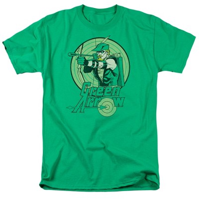 Join a vigilante superhero who fights crime using archery, martial arts, and technology. Centered on this tee is Green Arrow With A Bullseye. This soft men's green shirt is made from 100% pre-shrunk soft spun cotton, offering the most comfort for any hero. ?Sizes: S - XXL