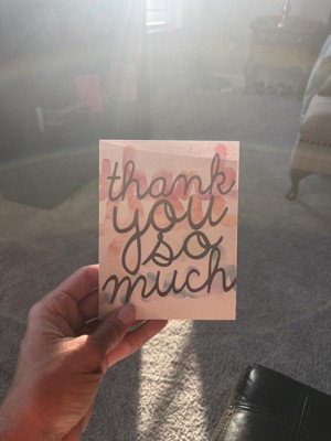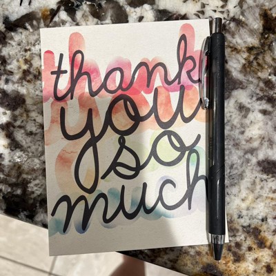 These thank you cards feature black, cursive "Thank You So Much" typography with rainbow watercolor accents set against a cream background. This boxed card set also includes 10 cards with matching printed envelopes.