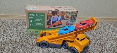 It’s off to the races with the Green Toys Racing Truck! The 3-piece set includes a bright orange Racing Truck and 2 Stack & Link Racers. The pocket-sized racers are the perfect size babies and toddlers, but are filled with fun for any age. The unique design allows for the cars to be used individually, stacked together, or linked in a chain. Each car also sports unique texture detailing for tactile stimulation. Hook the racers to the back of the Racing Truck’s extendable ramp, and when ready, release the car (or cars!) to zoom down! Made in the USA from 100% recycled plastic. No BPA, PVC or phthalates. Recommended for ages 6 months and up.