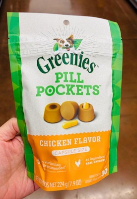- Contains: One (1) 7.9 oz. 30-count pack of Greenies Pill Pockets Large, Capsule Size Soft Dog Treats Chicken Flavor, Made With Natural Ingredients Plus Minerals & Trace Nutrients.