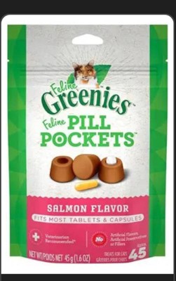 - Contains one (1) 1.6 oz. 45-count pack of FELINE GREENIES PILL POCKETS Natural Cat Treats Plus Minerals & Trace Nutrients, Salmon Flavor