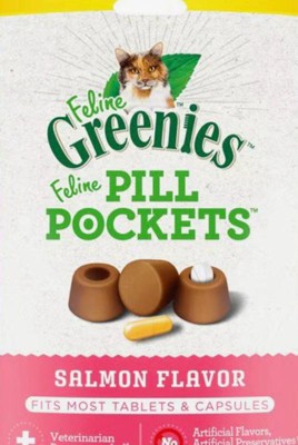 Take the stress out of giving your cat their medicine. FELINE GREENIES PILL POCKETS Treats for Cats easily hide most tablet-sized and capsule-sized pills in a great-tasting meaty treat that’s made with natural ingredients plus minerals and trace nutrients. These soft cat treats are the #1 vet recommended choice for giving pills* and feature a delicious salmon flavor that helps disguise the taste of the medicine. It's the hassle-free way to give your cat medicine... just place their medicine inside the pocket, pinch the pocket closed to secure the pill or capsule, and share with your cat. Just like that, the treat (and medicine) disappears. When it comes to taking meds, your cat is smart. But you're smarter... because you've got FELINE GREENIES PILL POCKETS Cat Treats. * Based on a survey of U.S. veterinarians