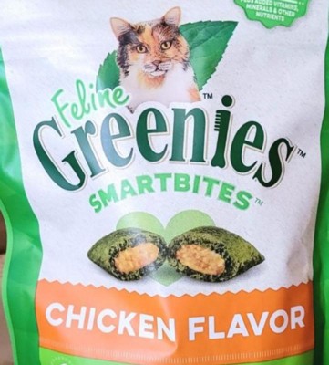 Greenies Smartbites - chicken flavored treats with soft center are fantastic! Feline loves the product which is a replacement of a different brand of soft chews that redesigned product that resulted in some terrible reviews regarding allergic reactions. Not only are the Greenie Smartbites enjoyed but they are also proving to support a visibly, wonderful coat. Too bad that the product is currently not available.