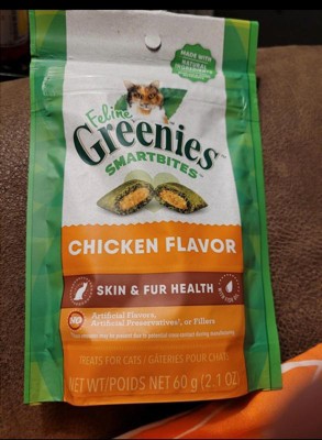 • 2.1 oz. Pack: Contains one (1) 2.1 oz. pack of Feline Greenies Smartbites Skin & Fur Health Cat Treats, Chicken Flavor.
