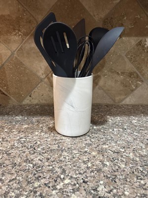 Absolutely love these grey utensils and marble-look crock. The utensils are sturdy and are a perfect companion to my GreenPan pots and pans. I also have the black GreenPan utensils but love how the grey ones look on my kitchen counter. Well worth the cost!