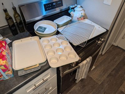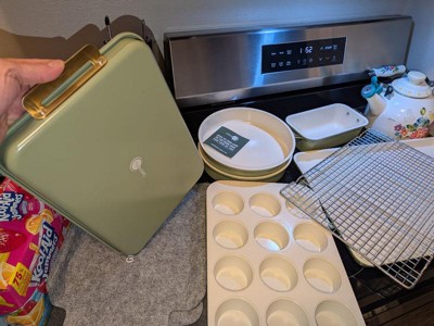 [This review was collected as part of a promotion.] The GreenPan Reserve 7 piece bakeware set in the sage color is a great beginner pan set for homeowners. The quality feels very solid and well made and the sage color is beautiful in person. The pans heat evenly and are easy to clean, which makes baking more enjoyable. I also appreciate that they’re dishwasher safe for quick cleanup. The only downsides are that the pieces are fairly heavy and can scratch easily if you don’t place protective sheets between them when storing. Overall, it’s a stylish, high quality set that works well for everyday baking.