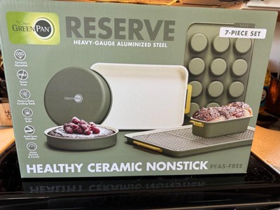 [This review was collected as part of a promotion.] This GreenPan reserve bakeware Seven-Piece set in sage color is now my favorite pans and I'm so glad I got to try them through influenster, I actually threw away all my metal non-stick baking pans because they get absolutely ruined after cooking but as you can see in one of my pictures, I cooked a salmon fillet with the skin on and nothing stuck to the pan, not even the oil stuck to the pan or ruined the pan like it does using the metal non-stick pans that you have to scrub and scrub and scrub and you still can't get the grease spots off, these pans are absolutely amazing!!! They are a little on the heavier side but I love them. They are extremely good quality and cleanup was a breeze since nothing stuck to the pan, I'm just literally in shock because whenever I cook I use a little bit of olive oil on my baking sheets and usually the salmon skin will stick to the pan and I have to scrub it off but not with these pans, You get the cupcake pan, the meatloaf pan, a small baking sheet and a cookie sheet, two round cake pans and a cooling rack... They are non-stick ceramic and toxin-free and I absolutely love them!