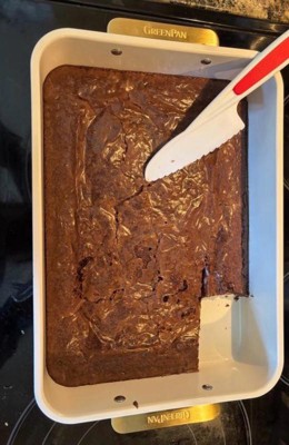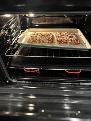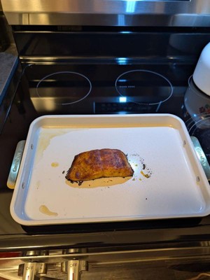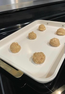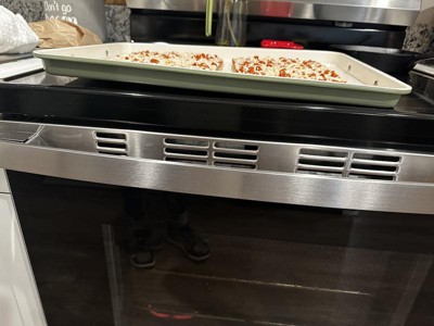So I’ve only us the smaller bake pan (it was fine so far baking cookies) As far as the larger one… Terrible! It’s first time using it. Says it’s durable, take 550 heat. Welp mine didn’t at 338 it buckled up scared crap out of me. Pulled out it took min to straighten out. Put it back in did it again now at 450 just gonna let it bake messed up since i got rid of all my kitchen items when purchased all green pan 🫣😩 Pretty upset for a pricey bakeware