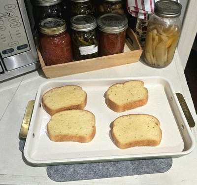 These are beautiful and a good size for small batches of cooking or baking. I love the color and the thicker handles. My only complaint is that one of the sheet pans arrived with a scratch near the handle.