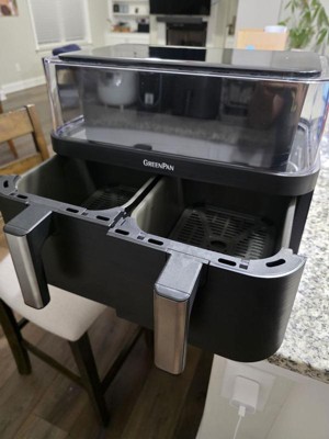 [This review was collected as part of a promotion.] I’ve been using this GreenPan air fryer and honestly, it’s been great. The design is one of my favorite parts—it looks sleek and modern on the counter, and the clear-view windows on both baskets are super handy for checking on your food without opening anything. It has a high-end feel with a very cool touch screen, and the dual baskets let me cook different things at the same time, which saves a lot of effort. It cooks evenly and quickly, and the ceramic nonstick coating makes cleanup a breeze. Plus, it’s free of harmful chemicals, which is a big bonus. Since it has two baskets, it’s definitely bigger than a regular air fryer, so keep that in mind if you have limited counter space.