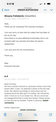 Bought this air fryer in March and love it! We have probably used it almost everyday since we purchased it. My only complaint and the reason I can't give it a full 5 stars is that the rubber stoppers on the insert never fit properly so within a few weeks they broke and now the insert doesn't stay put unless we very precariously place the broken stoppers on the corners. That one part is pretty disappointing as there is no way for me to get them replaced, but aside from that I love how quickly it heats up and the fact that I can see how my food is cooking.