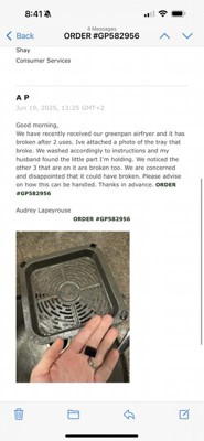 Very unhappy with this air fryer. I received it as a gift, that I picked out after reading reviews and having purchased other GreenPan products, and I wish I could return it. The air fryer itself is very sleek looking and easy to clean, much like the pans and cookware I own that are GreenPan. The air frying itself is the problem and the food does not come out crispy and plan on increasing the cook time more than what the recipe/package calls for. I have tried problem solving with using the different settings and also wanted to mention I do not overcrowd the basket. In a toddler household where there’s a lot of air frying going on, this product is a big disappointment.