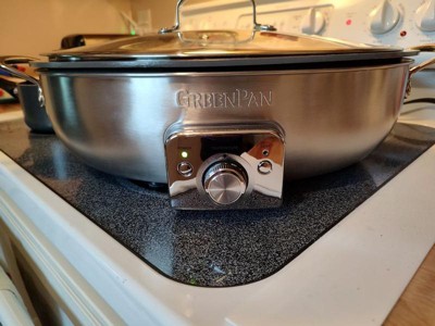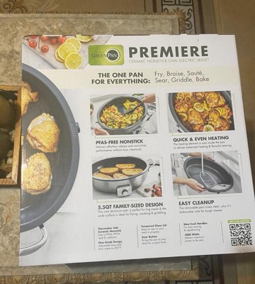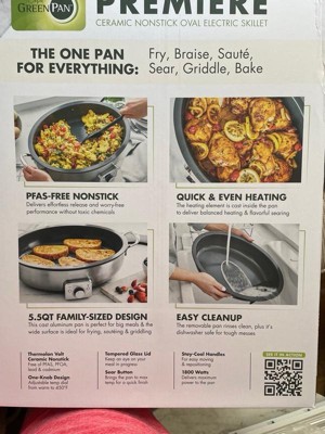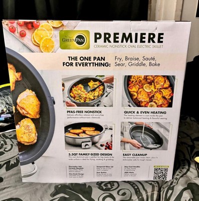 [This review was collected as part of a promotion.] I just got this GreenPan Premiere 5.5 Qt. Oval Skillet and I love it and use it everyday! It’s electric and has different temperature settings for precise, cooking temperatures which I love! The red light on the front blinks until the pan is completely preheated to your desired temperature then turns a solid red when it is completely pre-heated to your desired temperature! It’s so easy to clean. The pan comes out of the base and I don’t care what you cook in it it’s so easy to clean! It’s also dishwasher safe as well as the lid. Then all you do is wipe down the base with a damp cloth, put it back together and put it away! It is aesthetically, beautiful and very versatile from cooking breakfast to searing salmon, it even makes the perfect grilled cheese and bacon! I always fried my chicken in an iron skillet but this pan gives me the same result with that beautiful golden crust as an iron skillet does without all the maintenance of an iron skillet! It really looks great in my kitchen! It’s Stainless and the best part is! I can place the lid on to prevent splattering and it’s a green pan so This Pan is PFAS-FREE and never has TOXIC FUMES this is a Great pan. I love a good electric pan that I feel good about preparing food for my family and this one’s the best and safest I have ever found! This pan evenly distributed heat so all of my food cooks perfectly. It’s very durable and the handles and lid handle are never hot so you won’t burn yourself removing the lid or if you need to pick it up and move it while cooking!! I definitely recommend this green pan. It is the best green pan electric that I have ever tried. I Feel safe about preparing food for me and my family and have been looking for a product like this for a long time!