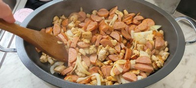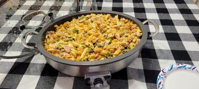 [This review was collected as part of a promotion.] as a father of 4, I try to find the fastest and easiest way to cook large meals, this skillet is a god send... I just finished cooking g our 1st meal and after searing the seasoned chicken, kielbasa, and bacon. it held so much more. all in all it held 1 kb of chicken, 2 lbs of kielbasa, half lb of bacon , 2 lbs of pasta, 1.5 lbs of cheese a half of an onion and still had some room to go. the cheese easily slides off the inner pan and clean up was easy breezey. it easily wiped clean with a damp cloth. the temperature gauge is simple to read and has a ton of temperature settings, I used the sear button amd the skillet got screaming hot and seared/ cooked the chicken in minutes. it is heavily built and seems like it can stand up to a lot of using. This will be a frequently used item in my home from here on out....