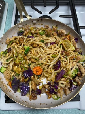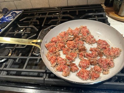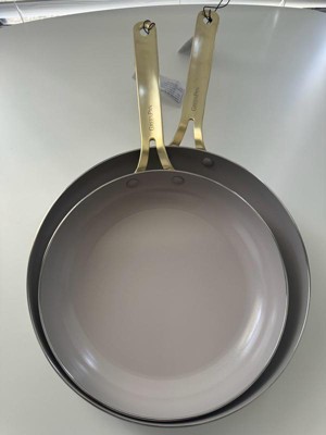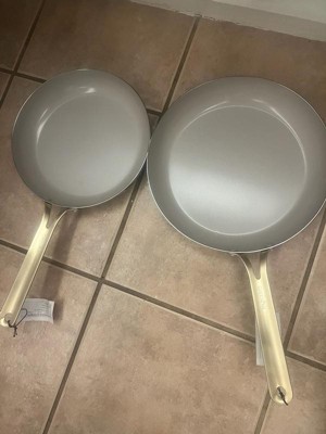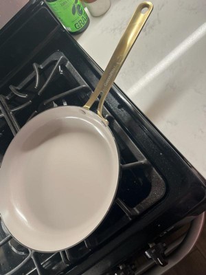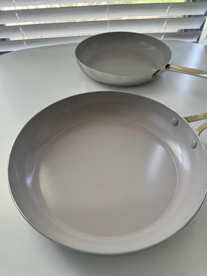 [This review was collected as part of a promotion.] I absolutely LOVE these pans! First and foremost, they are super chic. White and gold? Very classy looking. Definitely nice enough to leave out in the open, either on the stove or hanging, instead of hidden away in a cabinet. More importantly though, these are true to their word, and non stick. I say that with a big asterisk. From what I understand from reading up on ceramic pans, these need to be treated similarly to how you handle cast iron. Before my first use, I lightly coated the pan with vegetable oil (not olive). I then turned the heat on, let the oil hit the smoke point, and wiped it out. It was more of a precaution to try and ensure the pans stayed non-stick. With that done, I went to town on it. The pans seemed to heat evenly on my gas stove, but the burner did end up leaving marks shaped like the burner grate on the bottom. I’d recommend either sticking to glass top electric, or induction to prevent this. Personally, I am of a mind that things are meant to be used, not looked at. So I wasn’t particularly bothered by the discoloration marks on the bottoms. I may have been able to prevent this by just using a lower heat, but what’s done is done. The real test for me was my nemesis. Stir fry. I always have problems with sticking, especially the noodles. They adhere to the pan, and end up getting shredded to pieces when trying to scrape it off the bottom. I hate that so much. It just ruins the entire dish. I did not have that problem with these pans. I browned the meat first, which left some fond in the pan. Stir frying the veggies next cleaned that right up. Next was the most feared part - The noodles. My fears went unfounded. They did not stick AT ALL and I was able to get a little color on them. The final hurdle was the sticky teriyaki sauce. Still no sticking. Everything slid around in the pan life a dream, and slid right out onto the plate. Cleaning was simple. Again, treat it similar to cast iron. First, let it cool (this is important). Then, I use a very short hot water rinse to quickly get up most of the mess. I’ll admit, I was afraid to use soap after use, and didn’t. I then wipe them dry with a towel. I did have to put a little bit of elbow grease in with one of those scotch brite no scratch sponges on the soft side, but overall it cleaned up super well. There was a bit of residue left around the top edge of the pan where the seam is, but I’m not bothered by it. Overall, I really do love these pans. I’m hoping to get many, many long happy years of use out of them. Just remember to care for them properly, and do not use metal utensils. You will ruin the pans.