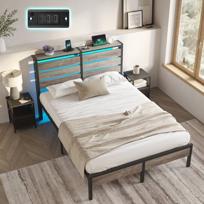 Greenstell Bed Frame with HIgh Upholstered Headboard & Charging Station and LED Light