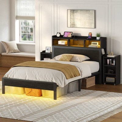 Greenstell Bed Frame with Headboard, Bed Frame with Built-in Charging Station & LED Light, Storage Shelf, Black