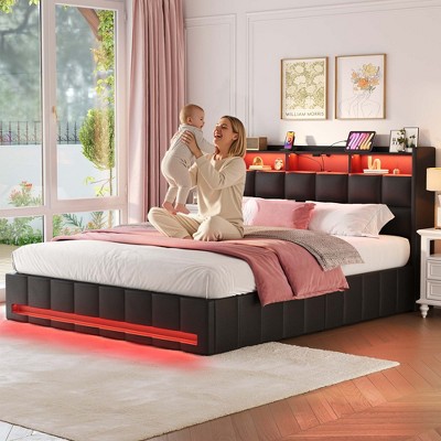 Greenstell Queen Size Bed Frame with LED Lights & Charging Station, Upholstered Storage Headboard with Shelves, Heavy-Duty Steel Slats, Black
