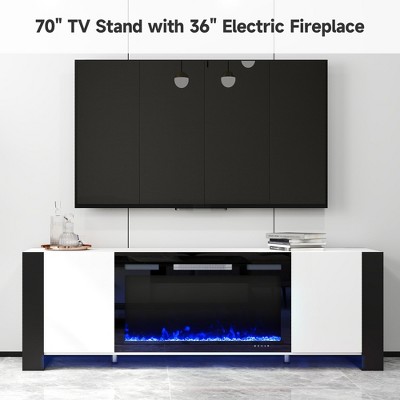 Greenstell The TV cabinet features a fireplace, two cabinet doors, an open storage space, LED lights, and a charging outlet