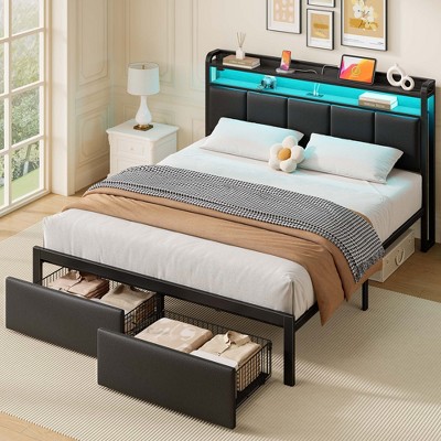 Greenstell Twin Size Upholstered LED Platform Bed Frame - 2-Tier Storage, Storage Headboard & Charging Station | Bedroom Furniture, Black