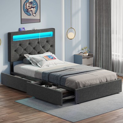 Greenstell Twin Size Upholstered Lift Up Storage Bed with LED Lights & Charging Station, Modern Platform Bed, Heavy Duty Wooden Slats, Grey