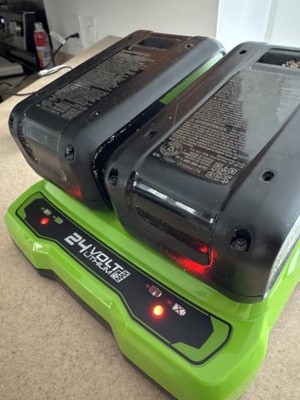 Hello blhoit. We are sorry to hear of your experience. This is a diagnostic charger. The Charger LED Lights will illuminate in specific order to communicate. the current battery status. They are as follows: Blinking Green > Charging. Solid Green > Fully Charged. Solid Red Over > Temperature. Blinking Red > Charging Fault. To charge the battery, first place battery on charger and make sure you connect the battery to the charger, you will hear an audible click or snap sound. Second, once the battery is secure, a green flashing light will indicate that the battery is charging. A solid green light indicates that the battery is fully charged. We would suggest, removing the battery pack and unplug the charger. Wait 1 minute and plug the charger back in and reinsert the battery pack. If this does not yield results, our team would be happy to investigate your warranty options. Please consider contacting us at 1-888-909-6757 or by starting a live chat (www.greenworkstools.com) for further assistance. All we ask that you please have access to the charger, battery, and tool for troubleshooting purposes.