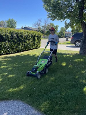 We bought this setup for our son who is twelve to do lawns this summer. We love the safety of the battery. No gas or oil to mess with. It’s easy to move and lightweight. It’s the perfect size for a small person. The only downside is that the wheels are any bigger as we have to have it on the tallest setting compared to a 3 on our old mower.
