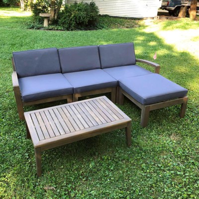 Transform your outdoor space into a relaxing lounge area with this Christopher Knight Home Grenada 6 pc Acacia Wood Sofa Set. With plenty of space for your guests and drinks, this set will bring your friends together for good times and even better conversations. Including one left-side piece, one right-side piece, one armless piece, one club chair, one ottoman, and one coffee table, this modular design is made to endure outdoor elements with its sturdy acacia wood frames and water resistant cushions. Make a comfortable conversation area in your backyard with this Christopher Knight Home Grenada 6 pc Acacia Wood Sofa Set.