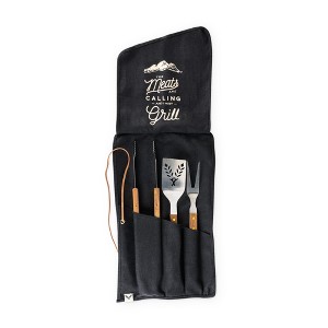 Nestled in this sturdy canvas roll-up are the three grilling amigos: your spatula, tongs, and fork. All three sport handsomely carved wood handles, and the spatula and fork end in convenient bottle openers.
