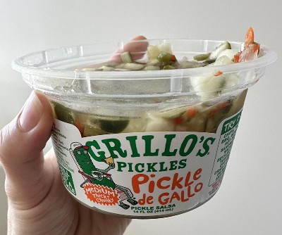 Your new favorite way to consume pickles has arrived. Grillo’s Pickles Medium Pickle de Gallo is a fresh take on salsa, and relish. Pairs perfectly with chips, hot dogs, tuna salads, burger bowls, tacos and pretty much anything else. Come take a dip in thick and chunky pickle-based salsa with thick-cut pickles, bell peppers, and onions. Elevate your condiments with Grillo's Pickles. Find us chillin' in the refrigerated section!