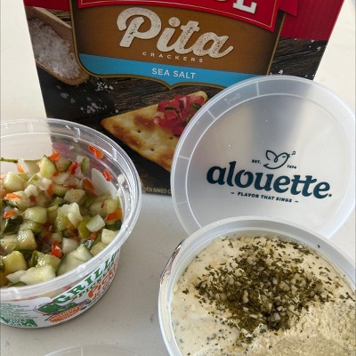 One of the best things I’ve ever had as a pickle lover. I like to put it on a pita chip with garlic and herb cream cheese, (the brand is in the photo if u wanna try) it’s my favorite snack. I’m obsessed.