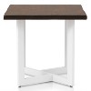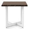 Evoke a clean and classic aesthetic with this compelling transitional end table. A rectangular end table complements any sitting area with a generous live edge style tabletop in a rich dark oak wood finish. It's anchored with a white finish metal base with a geometric angular design that draws the eye and adds a modern spin.
