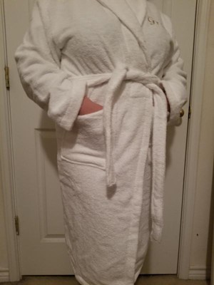 This bathrobe is great. It feels like a terry material but it’s long and absorbs water pretty good. It’s great size and has pockets which is a plus. I like that it’s embroidered on the side. It washes pretty well and stays the same form. I would recommend this to people that are getting married as a gift.