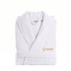 This terry cloth bathrobe is made for a luxurious experience, soft to the touch, and highly absorbent - helping you dry off with style, elegance, and comfort. Like all of our products, these robes are woven from thick, soft, 100% genuine Turkish cotton; they are exceptionally soft and become even softer after every wash. This robe is custom made, embroidered with the word "Groom" in Gold. These luxury Turkish robes are produced in Linum's green factory in Turkey, a state-of-the-art facility which runs on 100% solar energy. Machine wash in warm water, tumble dry low heat and remove immediately.