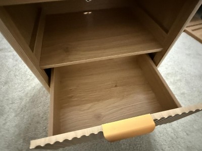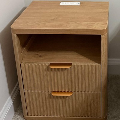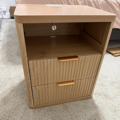Grooved Nightstand Set of 2, with Charging Station, 2 Drawers and Open Storage, Metal Handles and Curved Edge Design, Mid-Century Modern Style