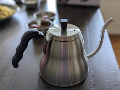 This is a great kettle to make hot water for pour over coffee or tea. It has a very modern look with a traditional twist. It looks lovely because the stainless steel on this kettle has a nice shiny shade to it. It is easy to use and clean. The handle is ergonomic and easy to hold even when the kettle is almost full up to its limit. Overall, a great buy.