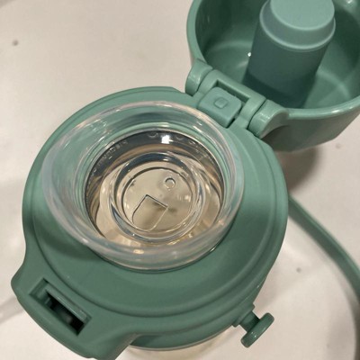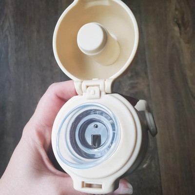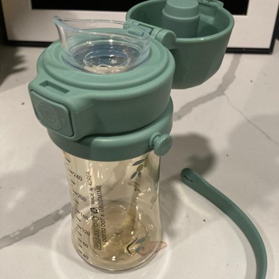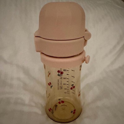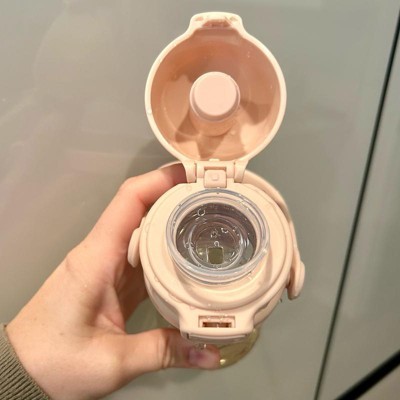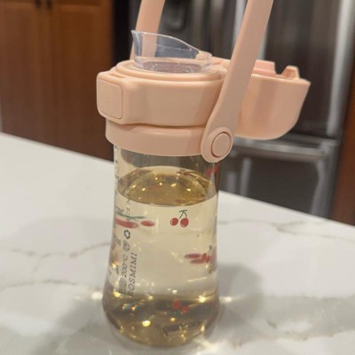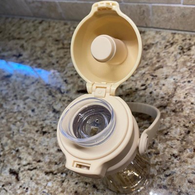 [This review was collected as part of a promotion.] Super cute bottle. My toddler decided to jump to using it right away. It appears to be good quality. It has an open spout so it has to be used with a baby or kid who is old enough not to spill it but with that said, not a lot of liquid spills out at the same time, just the right amount is coming out so my 16 month is perfectly fine with it. I like that there’s a handle, it’s long enough to allow the cap to open and doesn’t get in the way but it’s a little awkward. I wish it was a long strap so the kids can wear it cross body.