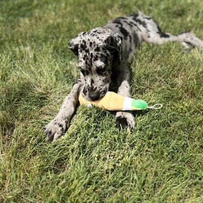 [This review was collected as part of a promotion.] Daisy is 12 years old and she loves her new toy! She likes that it both krinkles and squeaks. She loves to play fetch with it and chase after it. Daisy is not an aggressive chewer which should make this toy last awhile. She also likes to suckle her toys, so the lime wedge works well for suckling. The “Grrrrrona” was a perfect way for Daisy to help us celebrate Cinco de Mayo! I received an incentive to write this review.