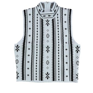 This knit sweater captures attention with its mixed striped pattern, offering a modern twist on a classic design. The mock turtleneck lends a touch of sophistication, perfectly complemented by the sleeveless cut that allows for versatile styling options. The back features a zipper with a hook and eye closure, adding a practical yet stylish detail to the overall design. Embrace the modern theme with this opaque sweater, a symbol of casual elegance that promises to elevate your style quotient with each wear.