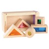 Can you match the sounds to the objects? The Rainbow Sound Blocks feature five blocks with colorful acrylic windows and inset objects for experiencing five unique sounds. The chunky design is ideal for little hands to grip for shaking, building or displaying in and out of the smoothly sanded wooden storage box. Put the blocks away in the handy, wooden storage box. Encourage children to build their fine motor, sensory and identification skills. Measures 4.75"W x 2.75"D x 9"H.