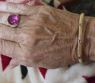 very nice bracelet I got it at the sale price of around $20 at Christmas time. it arrived quickly. Unfortunately, the red is more of a purple colored stone. I wanted to pair it with a ruby ring. I decided to keep it because I have a purple colored stone that happens to match it perfectly. Just know the ruby red is more of a purple pink and that is why I am taking off one star. Otherwise the bracelet is very nice!