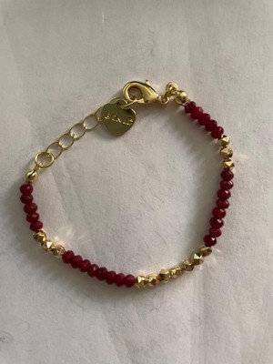 [This review was collected as part of a promotion.] This bracelet is 14k yellow gold plated with ruby red mineral beads. It has a lobster claw clasp which keeps it secure on the wrist. The links make it adjustable for a good fit. Very nice quality bracelet and I would recommend it for any little girl.